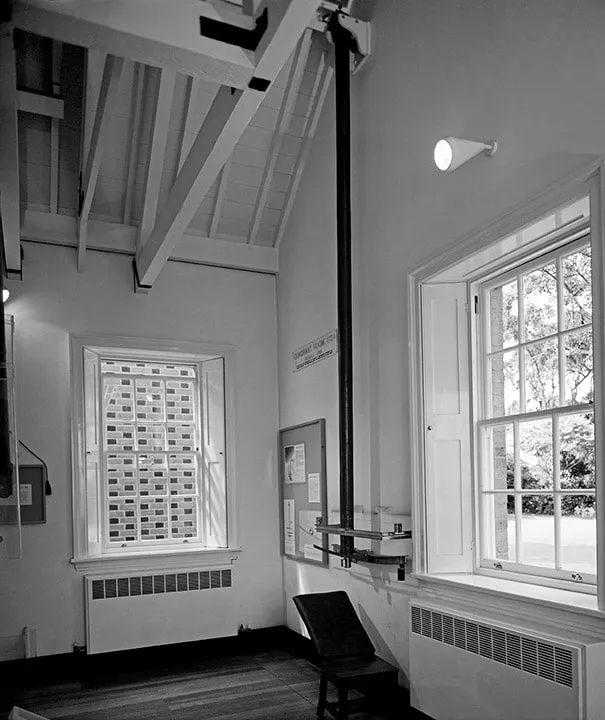 布拉德利委托人设计了一台精密的望远镜,它属于天顶望远镜(zenithtelescope),如下图所示,望远镜的主体是一根24.5英尺长的光学管,通过烟囱穿过屋顶。