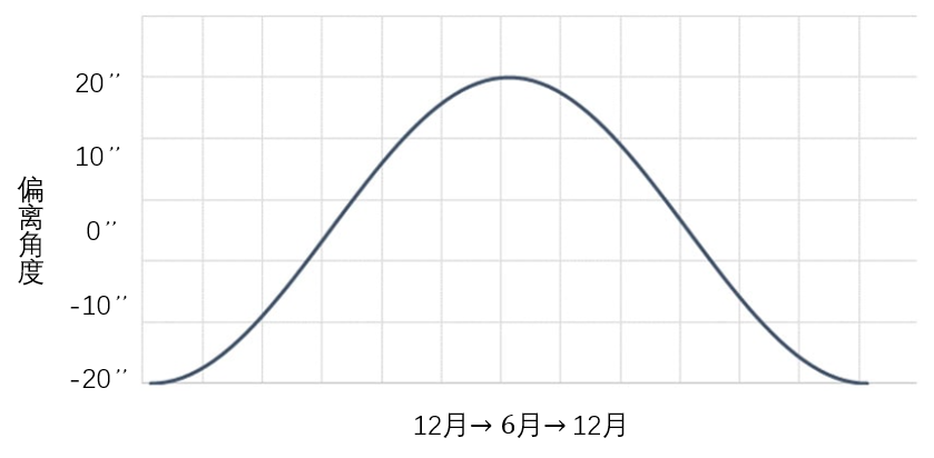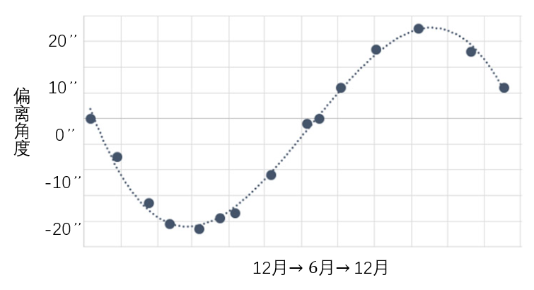 因此,布拉德利得到的那个偏离角度与时间的关系图实际上就是γ-Dra的光行差角随时间的变化规律。
