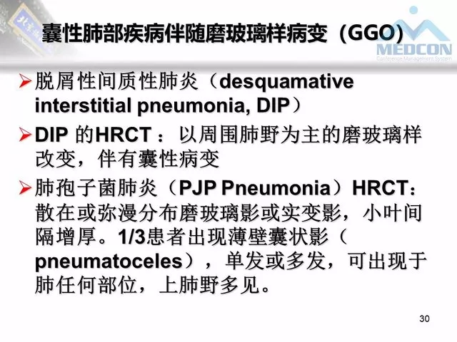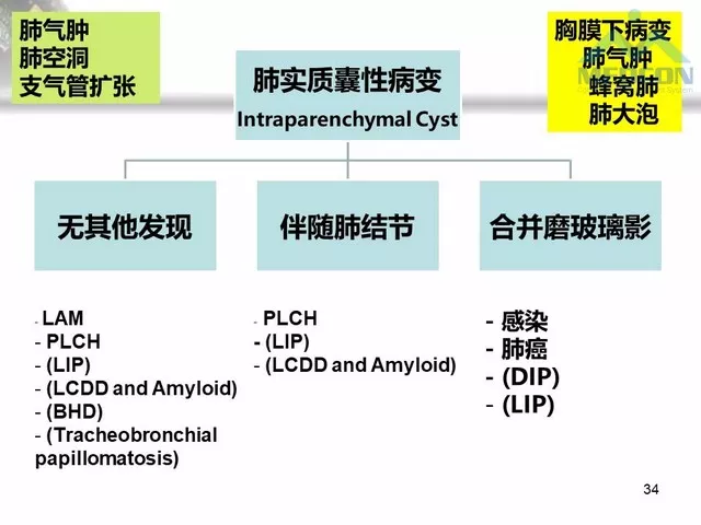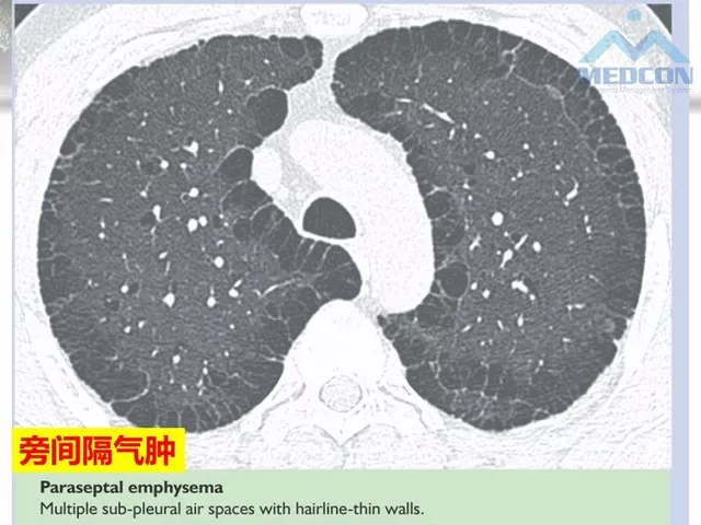3.间隔旁肺气肿:病变累及小叶边缘部分,多在胸膜下,可沿胸膜、叶间裂及纵隔旁分布,表现为胸膜下的小气泡。常同时伴有较大的胸膜下肺大疱。