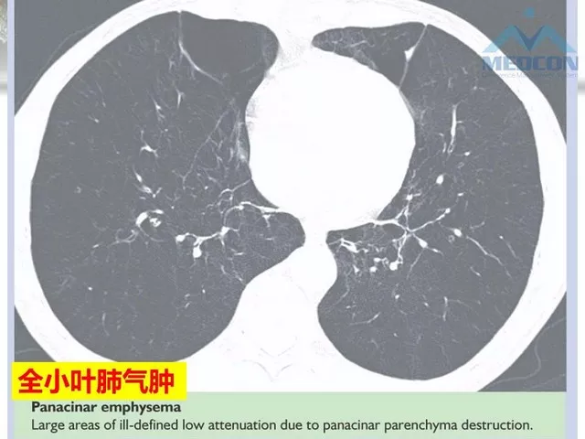 HRCT可以显示肺小叶的结构及异常改变,肺气肿的检出率很高,甚至在肺功能发生异常之前即可发现早期的肺气肿。