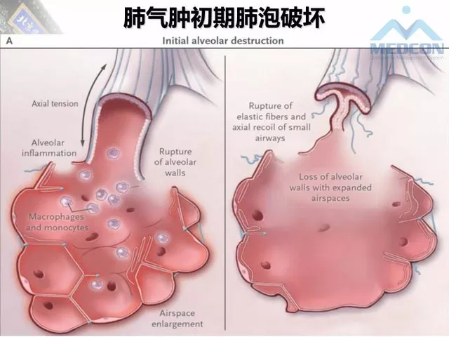 肺气肿是指终末细支气管远端(呼吸细支气管、肺泡管、泡囊和肺泡)的气道弹性减退,过度膨胀、充气和肺容积增大或同时伴有气道壁破坏的病理状态。按病因、病变性质和范围可分为弥漫性肺气肿、局限阻塞性肺气肿、代偿性肺气肿和间质性肺气肿;其中以弥漫性肺气肿最常见,主要由慢性支气管炎和哮喘引起;而X线平片发现局限阻塞性肺气肿要排除早期肺癌。