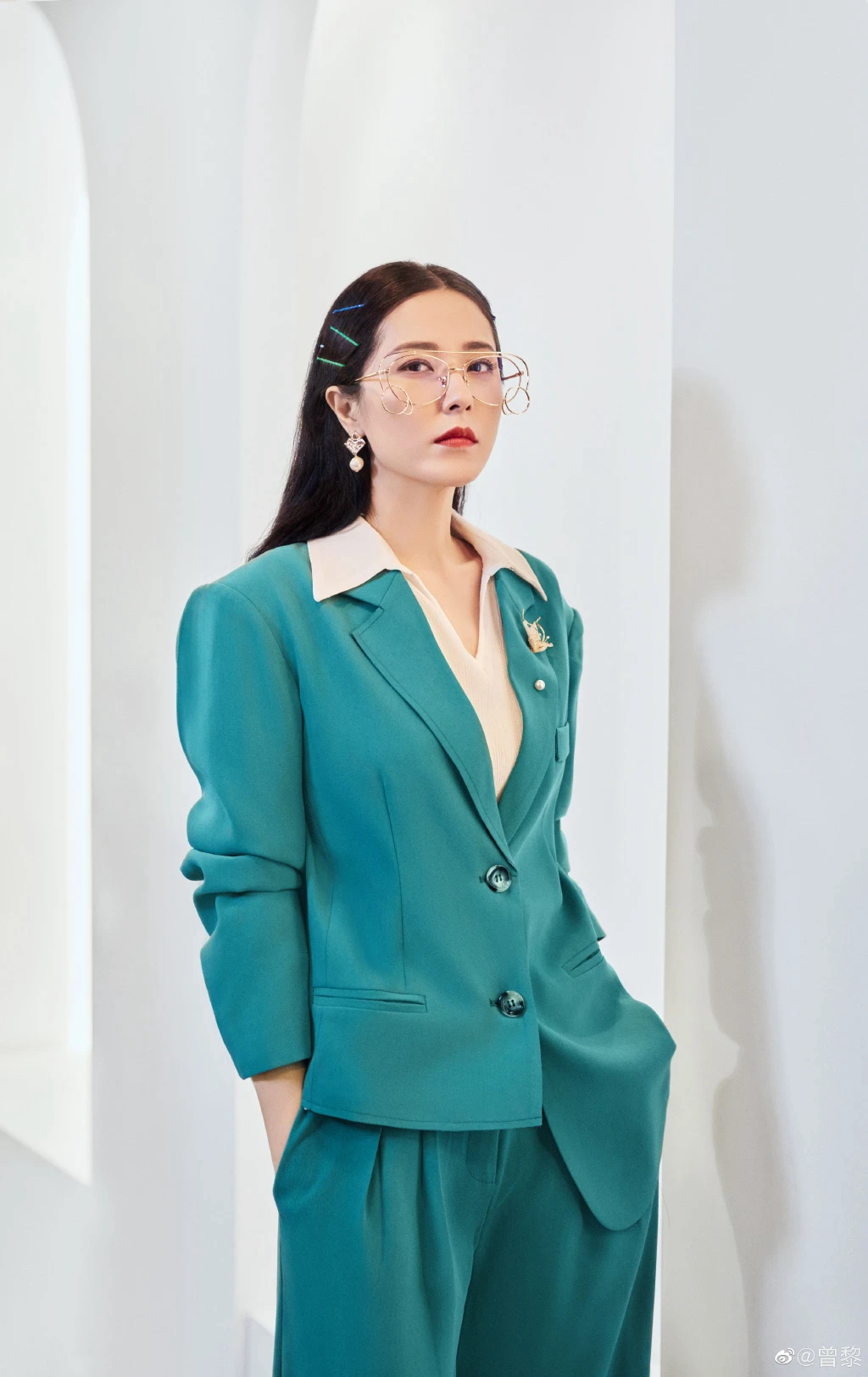 细边框眼镜可谓是长中庭的点睛之笔,从面部平衡一下中庭留白多的问题,而气质上更显知性、冷静。曾黎戴上眼镜,温婉立马就有了攻气。