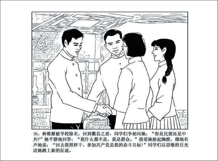 林维雁被学校除名,回到寝室,同学们争相问她:“你是民盟还是中共?”她平静地回答:“我什么都不是,我是群众。”接着她挺起胸膛,掷地有声地说:“回去我照样干,加入共产党是我的奋斗目标!”同学们以崇敬的目光送她踏上新的征途。