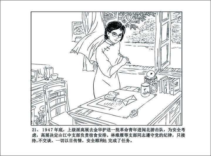 1947年年底,上级派高展去金华护送一批革命青年进闽北游击队,为安全考虑,高展决定由江中支部负责其食宿安排。林维雁等支部同志遵守纪律,只接待、不交谈,一切以目传情,顺利完成了任务。