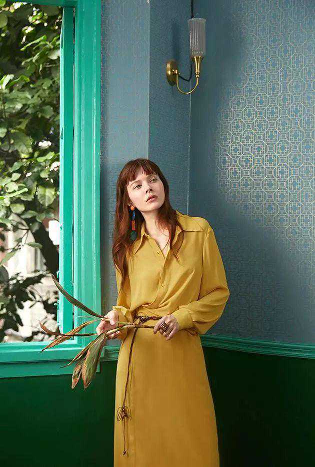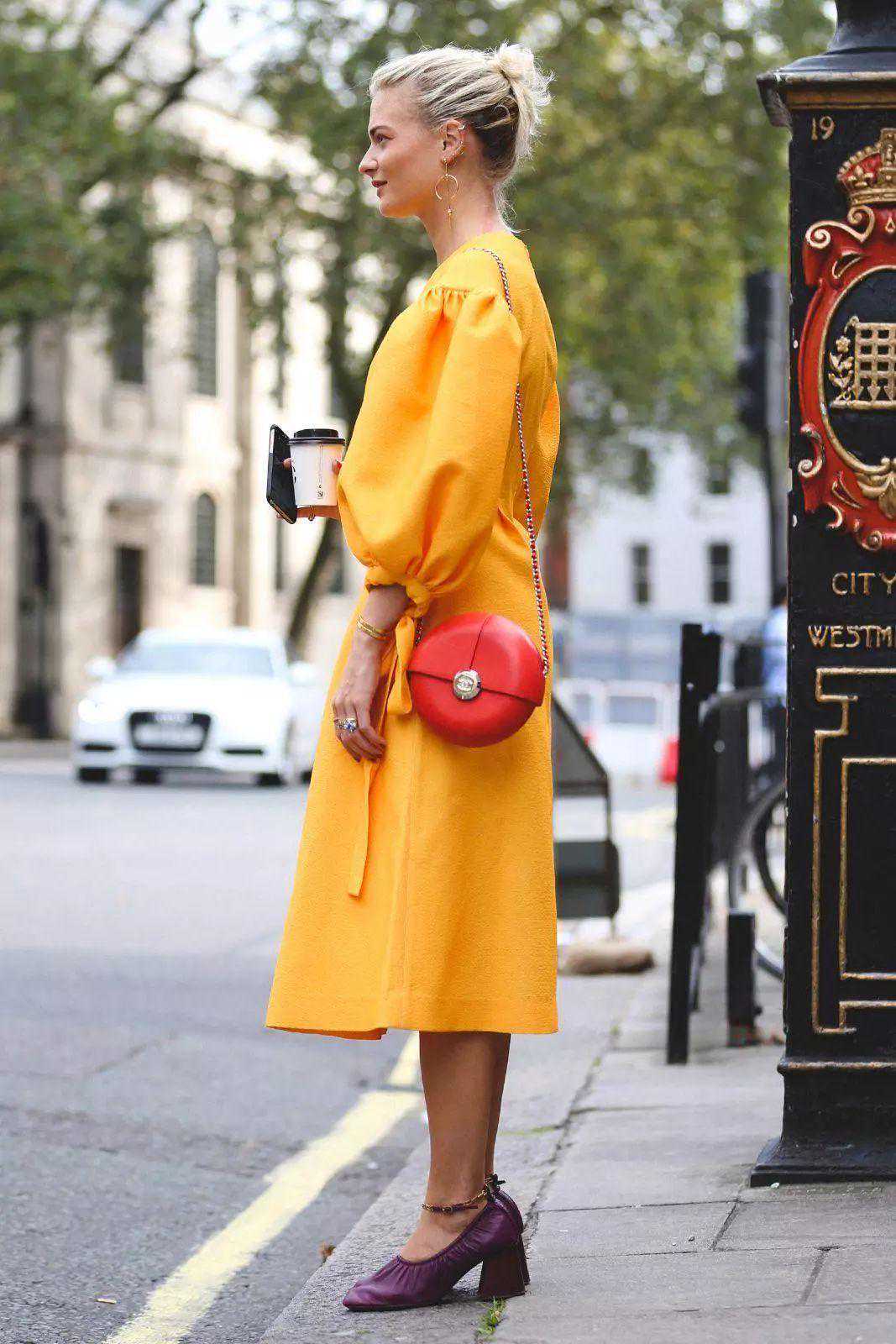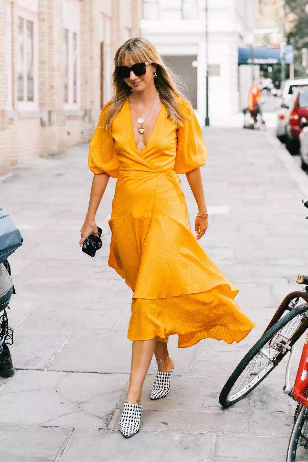 而且姜黄色比芒果黄多了一点沉稳感,不会像芒果黄那么饱和那么亮眼,一件连衣裙,简单的搭配一个黑色或者褐色的腰带提高腰线,就可以拉长比例。