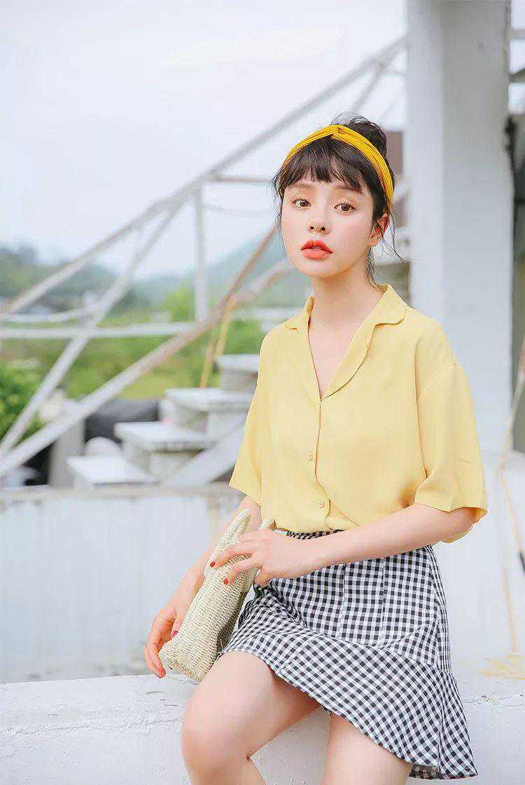 浅黄色上衣搭配一条黑白格子的裙子,也非常OK,因为黑白和黄色本来就很搭的啦~加上一天同色系发带别致又有心机,虽然发带是姜黄色,但是由于是以头发为背景的,所以不用担心显得脸黄。