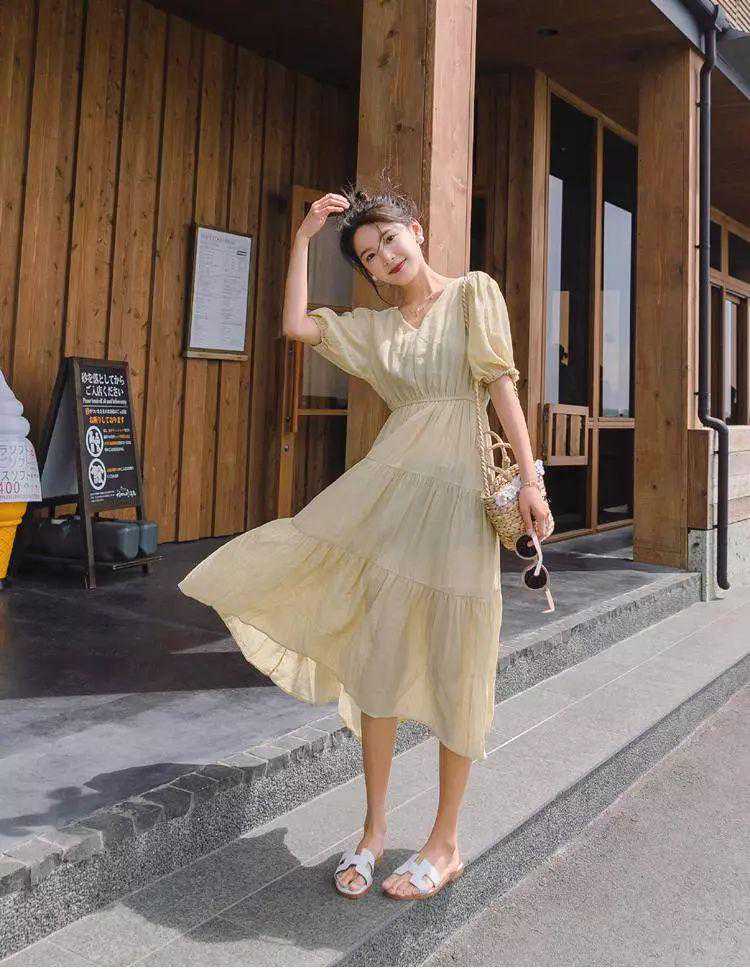 浅黄色的连衣裙,完完全全的文静感,但是隐约中又透露中一点亮眼,非常OK!