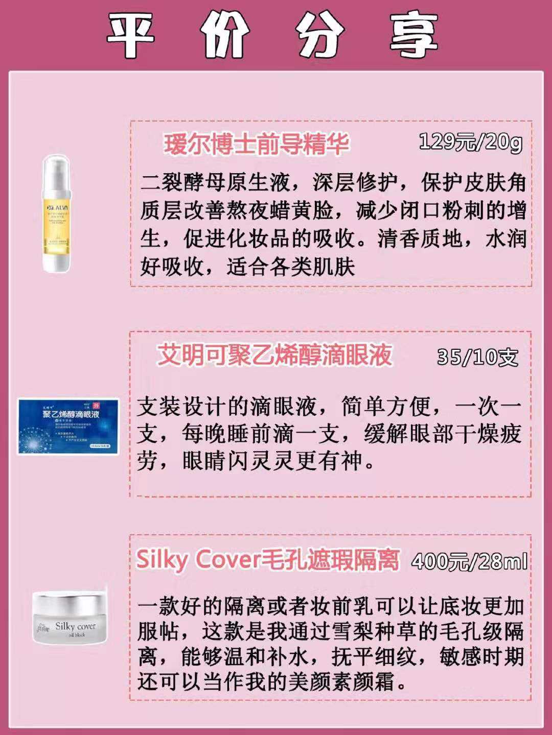 关于选择什么样的护肤品和化妆品,Daisy给大家做几个简单的好物分享,它们平价又好用。第一个是瑷尔博士前导精华,它质地非常的轻薄水润,对各种肌肤来说都是合适的,关键是20g才129元,性价比很高了。第二个是爱艾明可聚乙烯醇滴眼液,一次一支方便干净,对于有戴美瞳或者隐形眼镜的姑娘来说可以很合适。最后是SilkyCover的毛孔遮瑕隔离,堪称是美妆界的反孔精英,水润又服帖,还能当做是素颜霜使用。