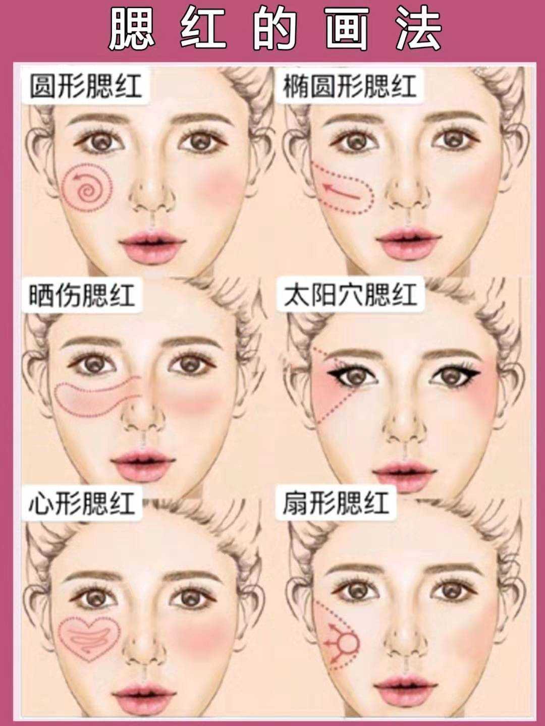 眼妆部分结束以后便是腮红,腮红和口红一样都是为了让我们的气色变得更好。而腮红的画法有很多,比如说图上所示的这些都是常见的腮红处理方式。但不管选择哪一种,一定记住是从下到上的手法。