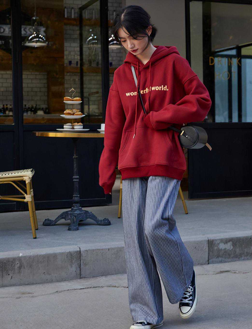 如果觉得单穿卫衣比较乏味,也可以在里面叠穿一件T恤或衬衫,增加造型的层次感,时髦度便能提升一个档次。