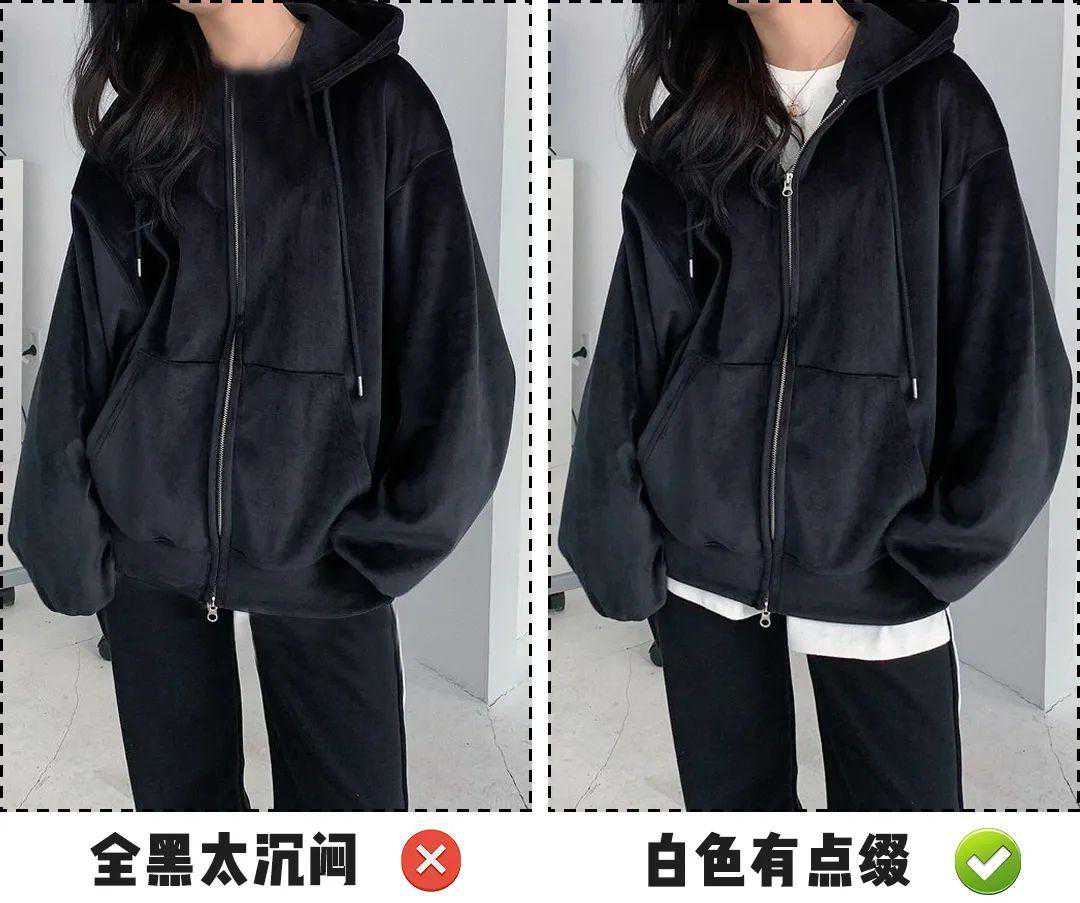 比如这身黑色的穿搭,左边看起来就很普通沉闷,当把内搭的白色T恤露出一部分的领口和衣角,是不是瞬间好看许多,有了白色的点缀,便能打破那种沉闷感。