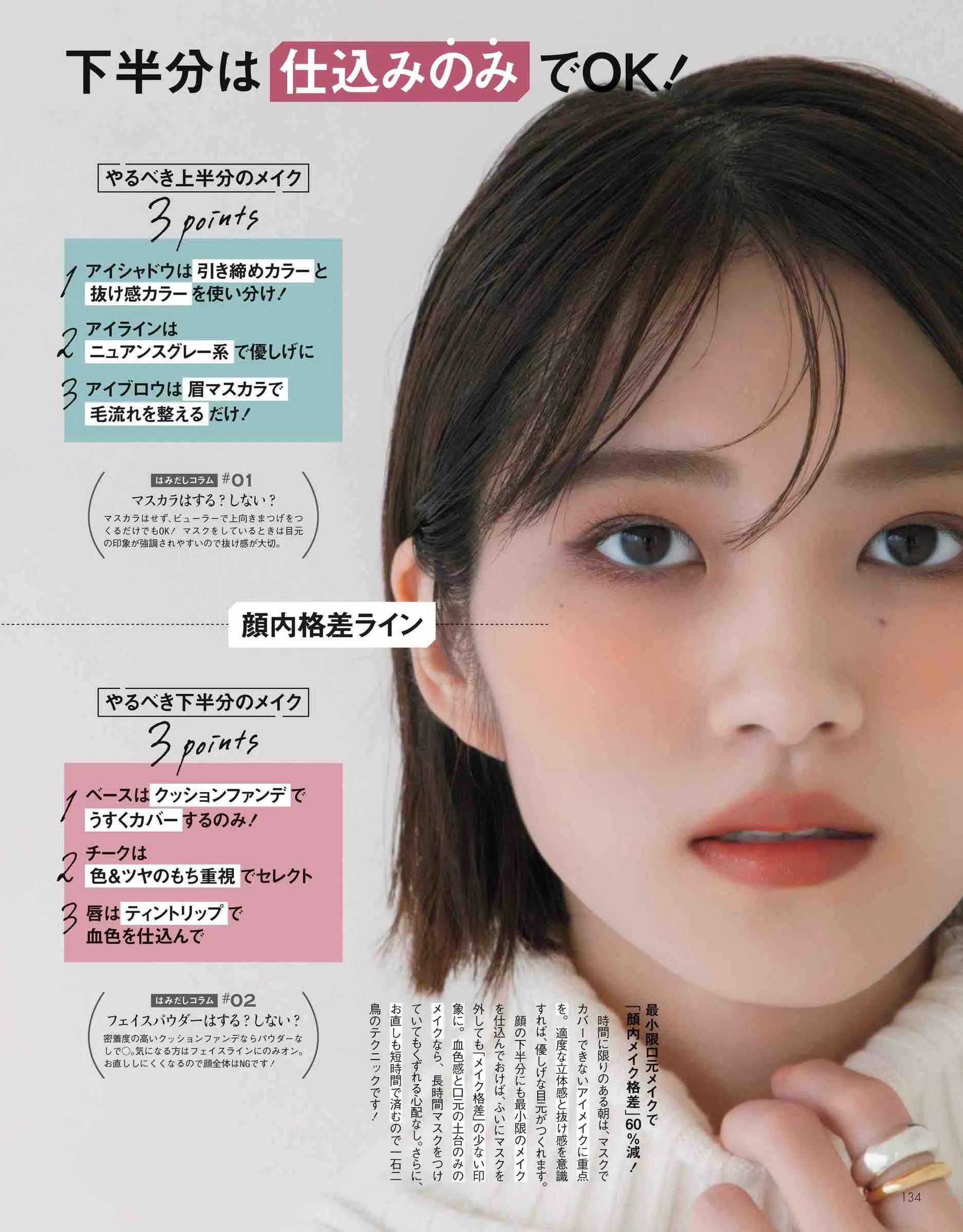 这里的睫毛和眼线是属于弱化的区域,强化的部分是跟色彩关系比较密切的眼影、腮红和唇妆,看上去就像是脸上泛出的自然红晕,有妆似无妆的初级境界,你get到了吗?