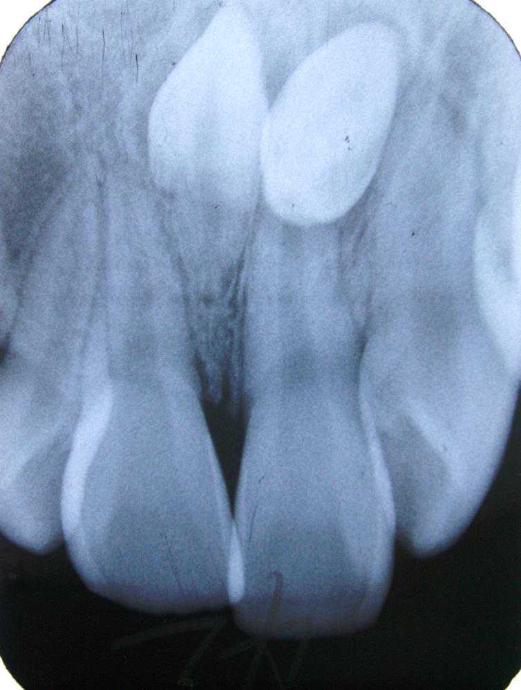 齿我妹妹的上门牙最近总是疼,去医院拍了个牙片,竟然发现在两颗门牙之间还有一颗牙齿。从外表根本看不出来,是在骨头里面埋着的。(图123)