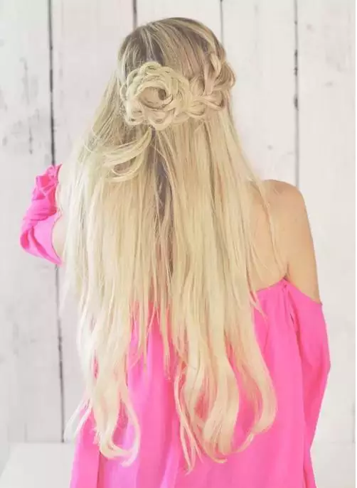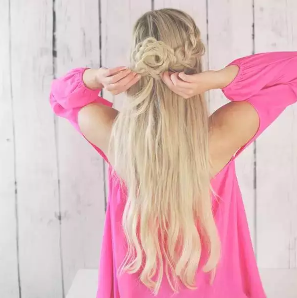 Step3:将发辫拢到脑后,然后将发辫在脑后卷成一朵花朵的形状,卷好后用钢丝夹将花朵固定好。