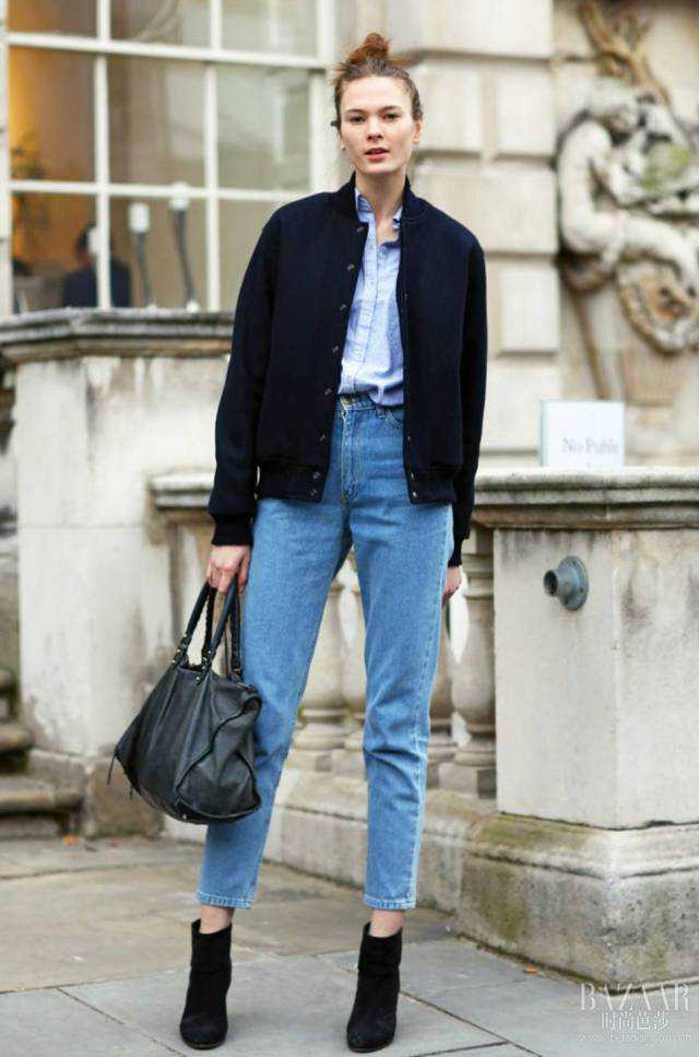 Momjeans搭配藏蓝色棒球衫,扎上一个清爽的丸子头,英气又显高挑~