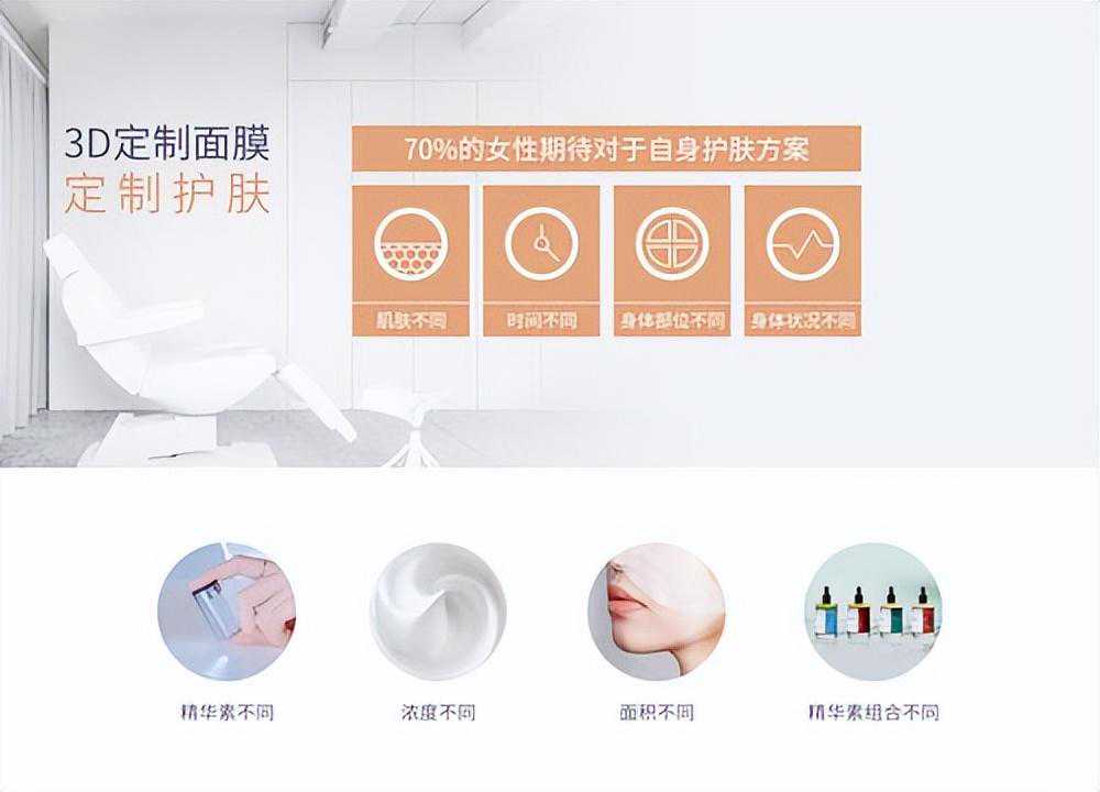 除此之外,我们还采用了3D打印技术现场定制面膜,针对客户脸型和局部皮肤肤质状况进行个性化定制。对于特殊皮肤,我们更是提供智能机器和人工配方师的双重服务,确保客户的护肤效果和肤感都得到极大的提升。