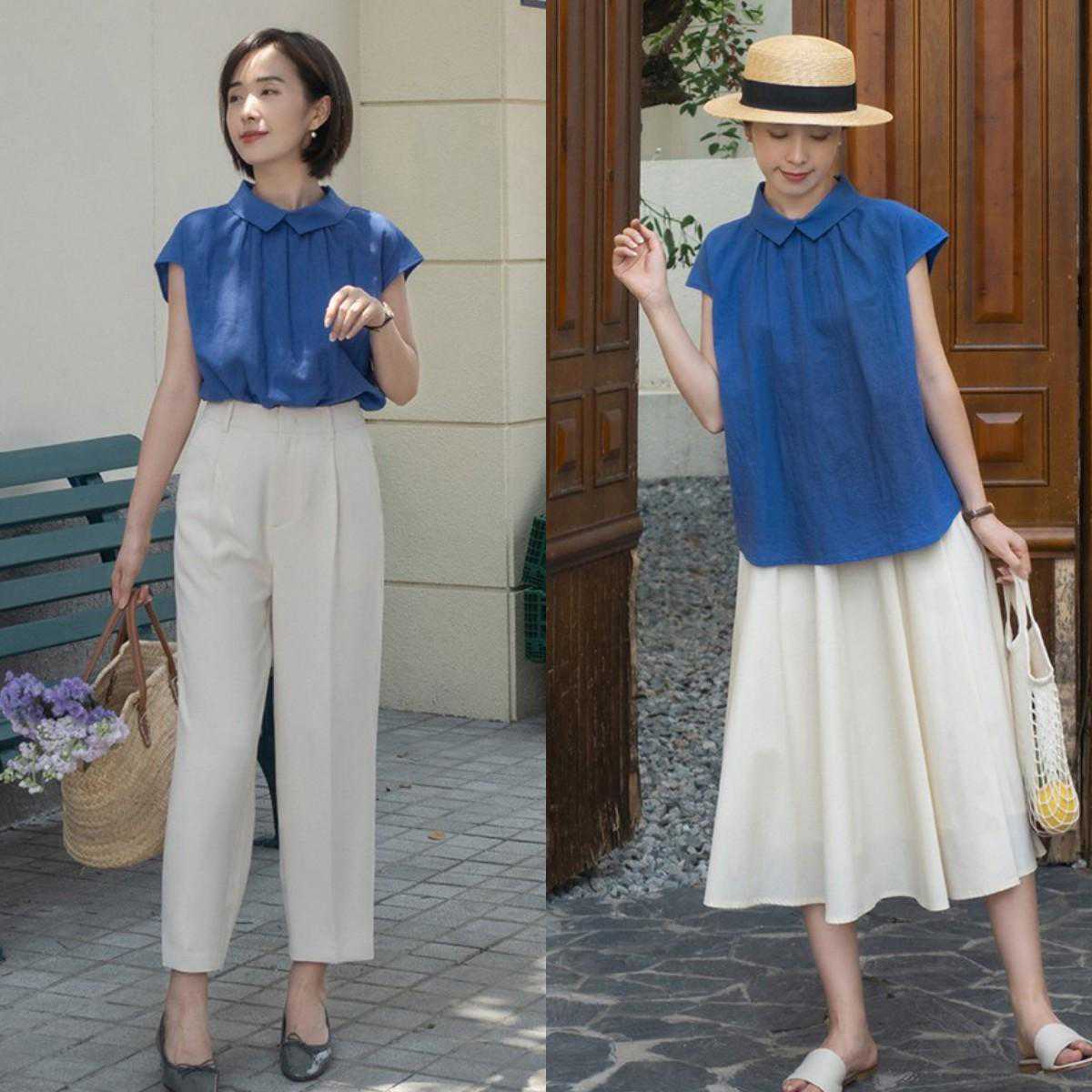 可若是想演绎出更加干练得体的造型,那不如试试下图中的这种选用了“小翻领设计”的棉麻无袖衬衫。用小翻领的设计增添正经、严肃的气息,结合棉麻的材质,既能打造出法式复古的通勤风效果,还能满足透气感的需求,能让你的气质加分不少!