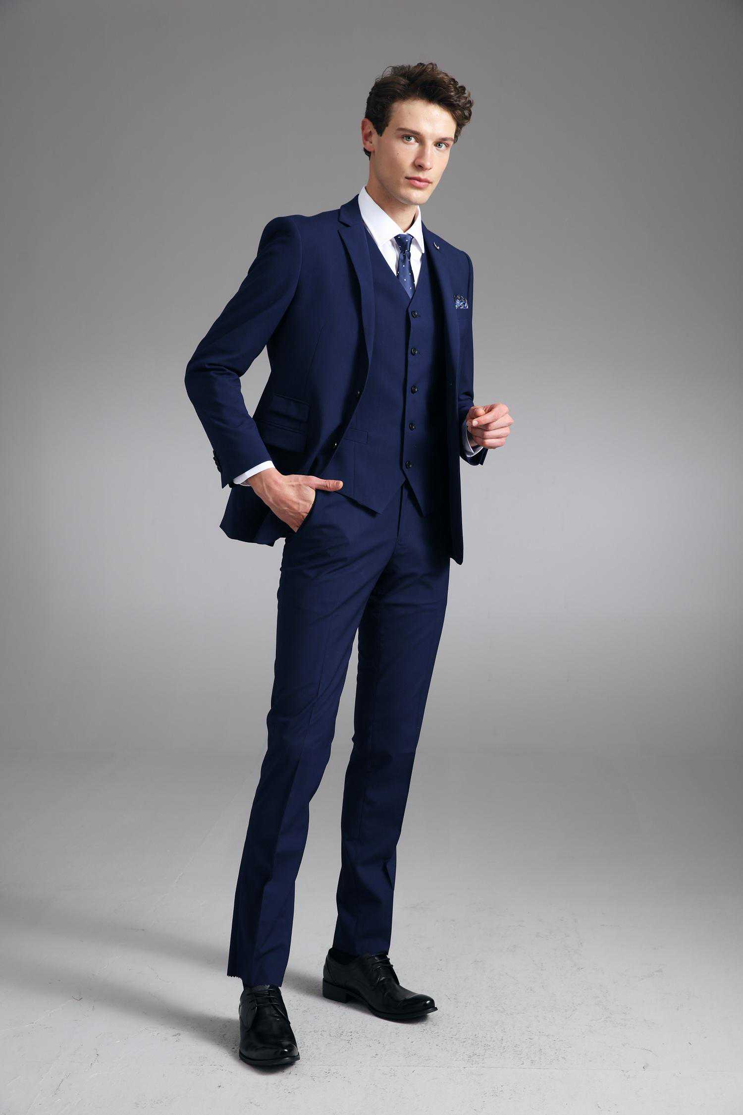 因为考虑到西装的正式性,一般蓝色系的西服套装都是以色调较深的藏蓝、海蓝色为主的,
