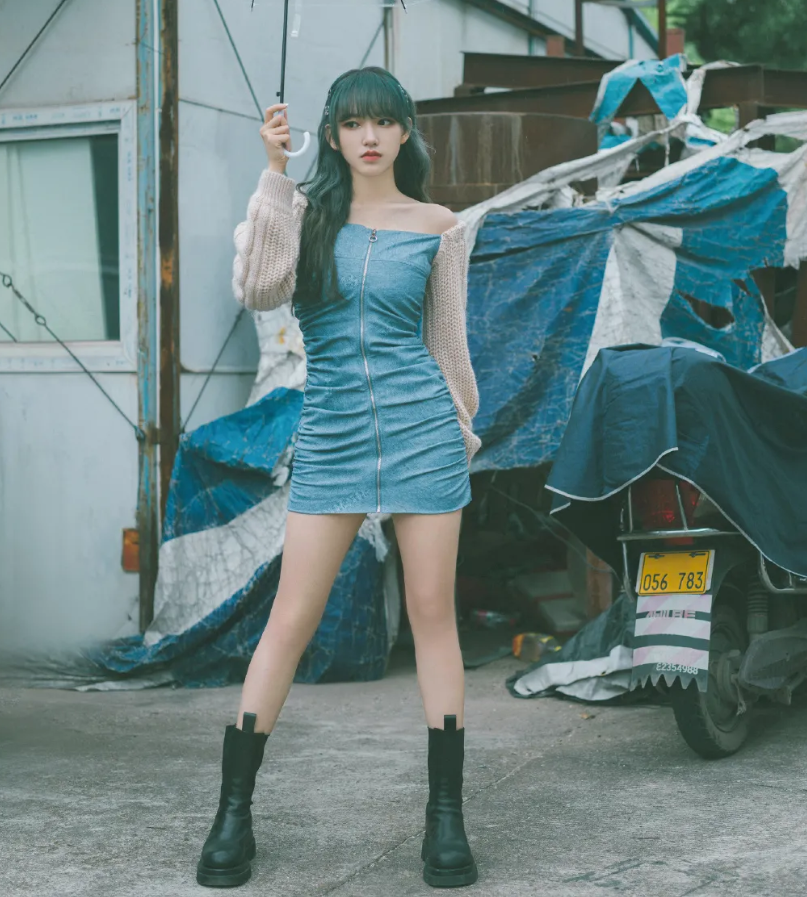 前面两款裤子的长度于某些人来说还是接受不了的,因此可以稍微放一点。直筒的吊带裙内搭白色甜美风泡泡袖衬衣,再一双个性感十足的马丁中筒靴,有一种文艺少女的质感。而中间露出来的腿腿,就是这套搭配中最点睛的地方。