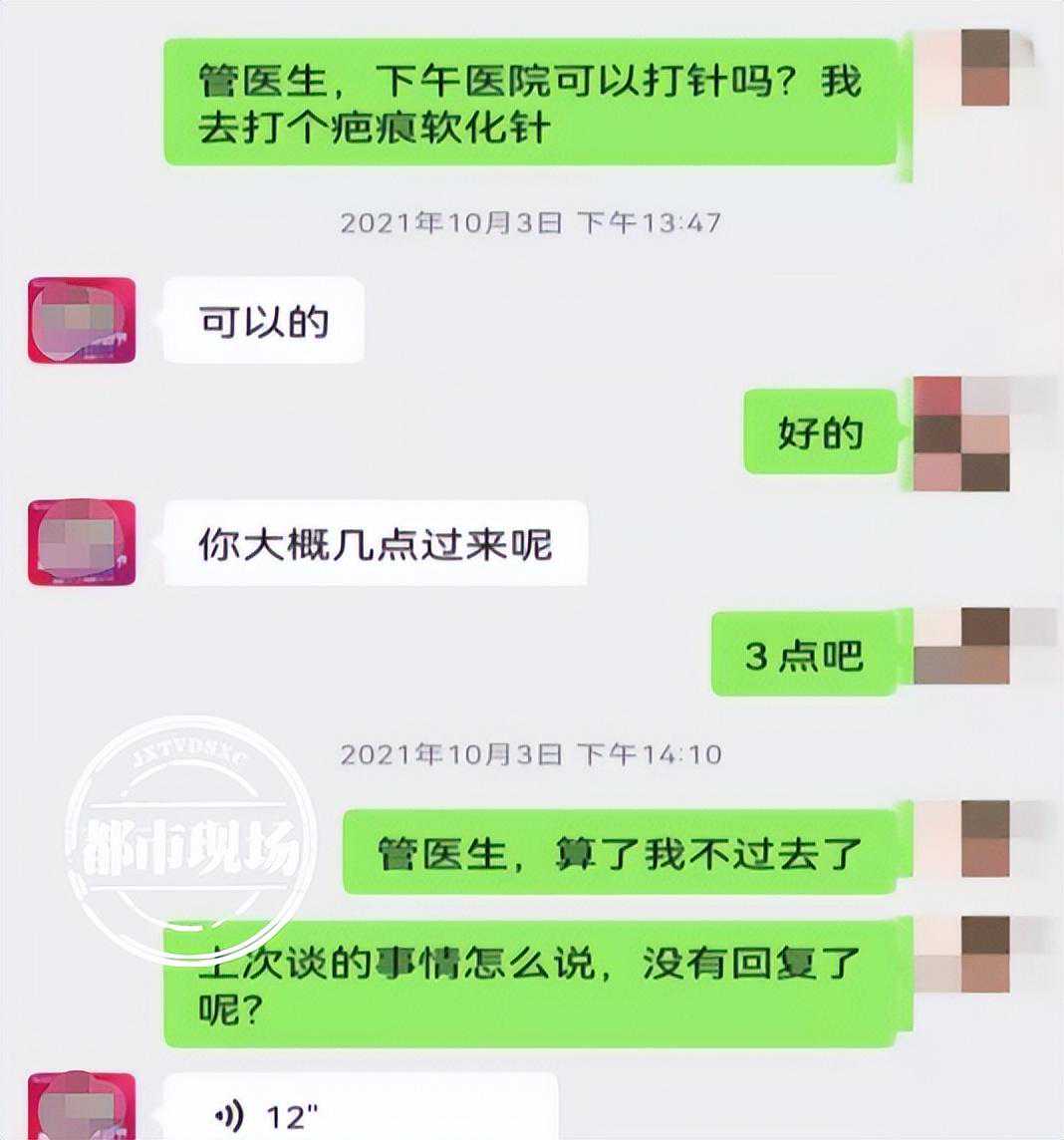 小陈表示,之前接待她的是“南昌同济美容医院”的一名管姓医生,医院大楼被拆除后,这名管医生去了“星禾荟医疗美容门诊部”上班,还曾多次邀约她到“星禾荟”来做疤痕修复,双方有微信聊天记录为证。不过,当小陈再次找到管医生,对方却有意回避。