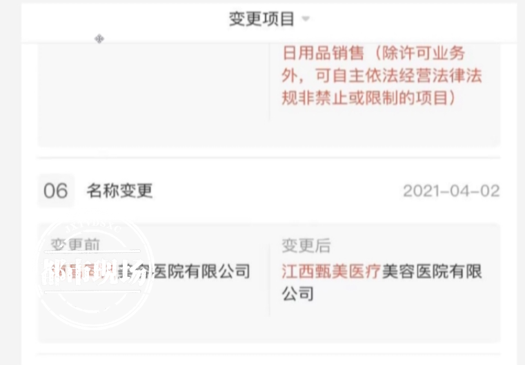 记者查询发现,2021年4月开始,“南昌同济美容医院有限公司”更名为“江西甄美医疗美容医院有限公司”。从2022年1月30号开始,地址也变更为西湖区洪城路778号星禾国际302室,也就是说,“甄美医疗美容”设在"星禾荟医疗美容门诊部"所在办公楼的三楼。不过当记者找到这里时,发现不但有“甄美医疗美容”的招牌、宣传展板、咨询室,还有“星禾荟医疗美容门诊部”的美容科室。