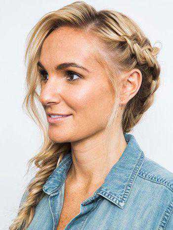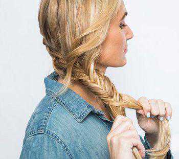 第二步:倾斜的蝎子辫编发一直延伸到另一侧耳朵正下方,将所有的直发都编进了发辫中,然后将剩余的长直发编成鱼尾辫。如图所示。
