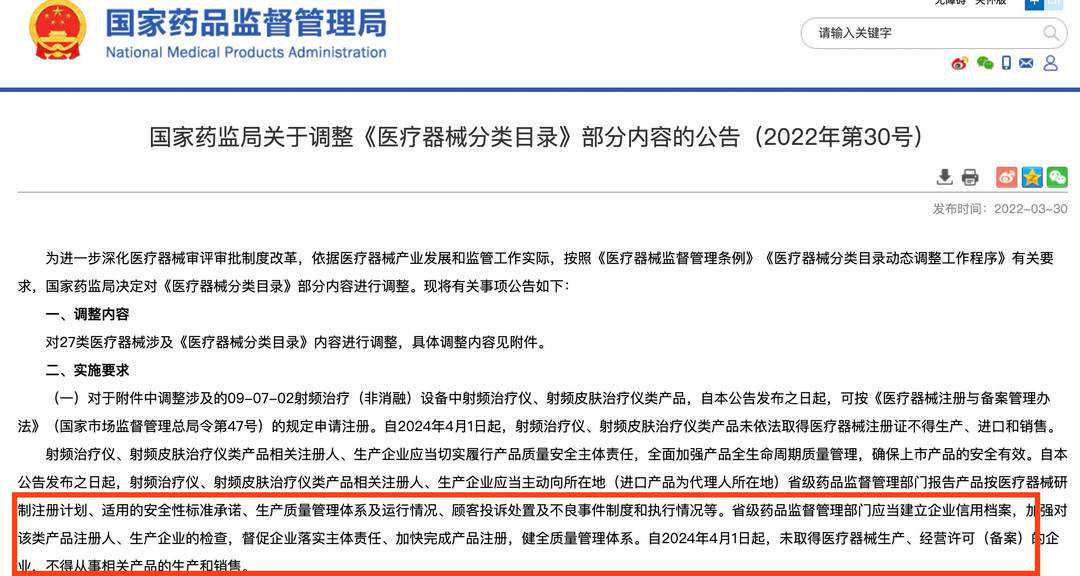 2022年,《国家药监局关于调整〈医疗器械分类目录〉部分内容的公告(2022年第30号)》中明确提出,自2024年4月1日起,《射频美容设备注册审查指导原则》将正式实施,射频治疗仪、射频皮肤治疗仪类产品未依法取得医疗器械注册证不得生产、进口和销售。