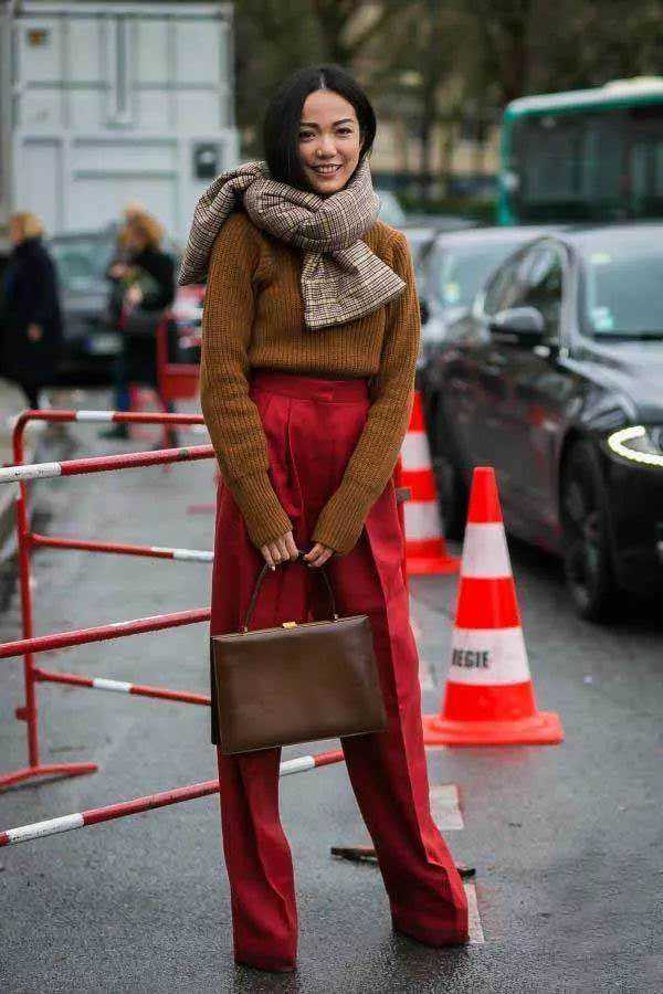 衣橱里深棕或咖啡色毛衣,很难配出感觉,可以试试配一条红色裤子,惊艳之余不失大气,是这对配色最美的优点。反之,红色毛衣+棕色下装也不错。