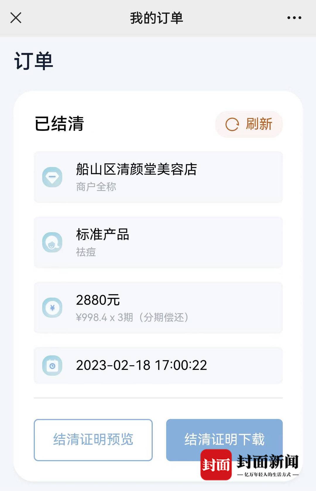 随后,钟先生购买了400元洗脸祛痘产品,在使用时,又被对方“劝说”可以购买更高级的套餐。“这个产品价格8880元,一年12次到店祛痘。”3月24日,面对封面新闻采访,钟先生回忆说,在得知自己暂无消费能力后,对方给自己推荐了一款贷款产品,8880元分18期偿还,每一期还款592元,“这样算下来,我实际要付本息10656元。”