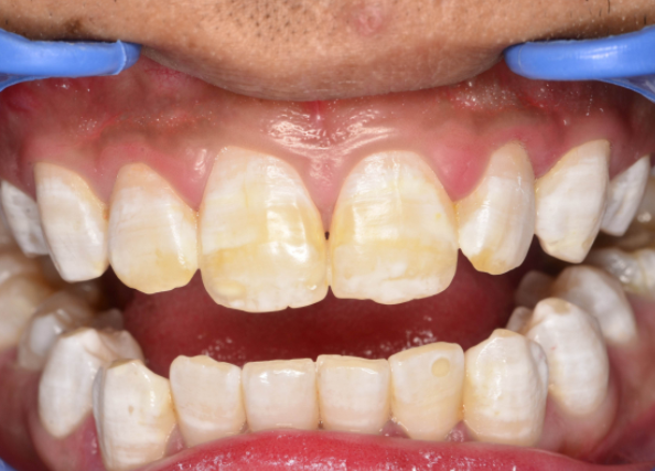 这个是针对严重的氟斑牙,不仅改善牙齿颜色问题,并且改善牙齿形态问题。牙齿贴面、全瓷冠治疗原理很简单,就是在原本氟斑牙上套上冠、贴面以遮挡颜色和不良的牙齿形态。效果非常好。