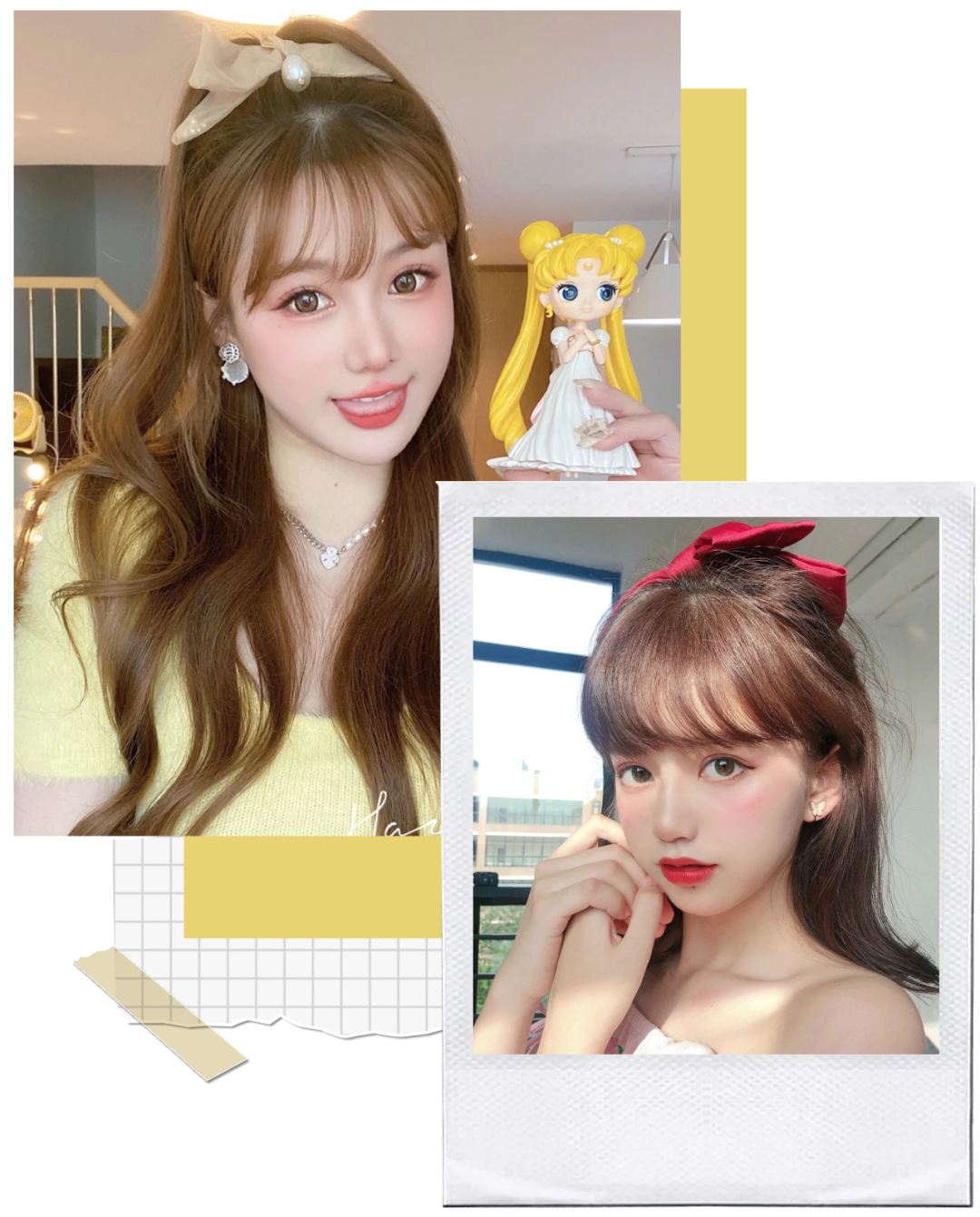 要是尖头、方脸的话,戴头顶就不管用了,会显得尖头更尖。而是把小蝴蝶结别在额头两侧,跟眉眼平行。这样大家的视觉重点就会放在温柔的眼波,可以有效地弱化头型脸型的缺点~