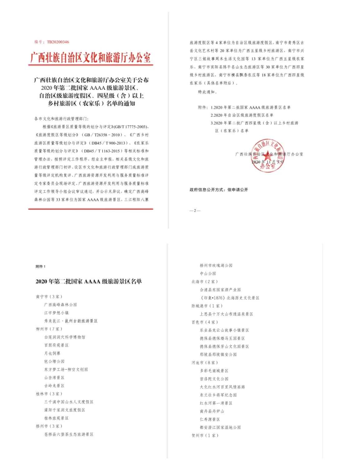11月3日,依照《旅游景区质量等级的划分与评定》与《旅游景区质量等级评定管理办法》,经各级旅游资源评定机构初评、复评与推进,广西旅游资源开发利用与服务质量标准评定专家委员会评定,并公示无异议。江宇梦想小镇景区达到国家AAAA级旅游景区标准,正式被评定为国家AAAA级旅游景区。