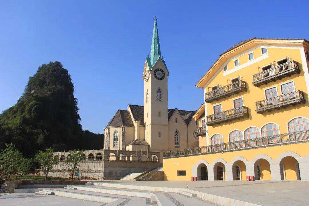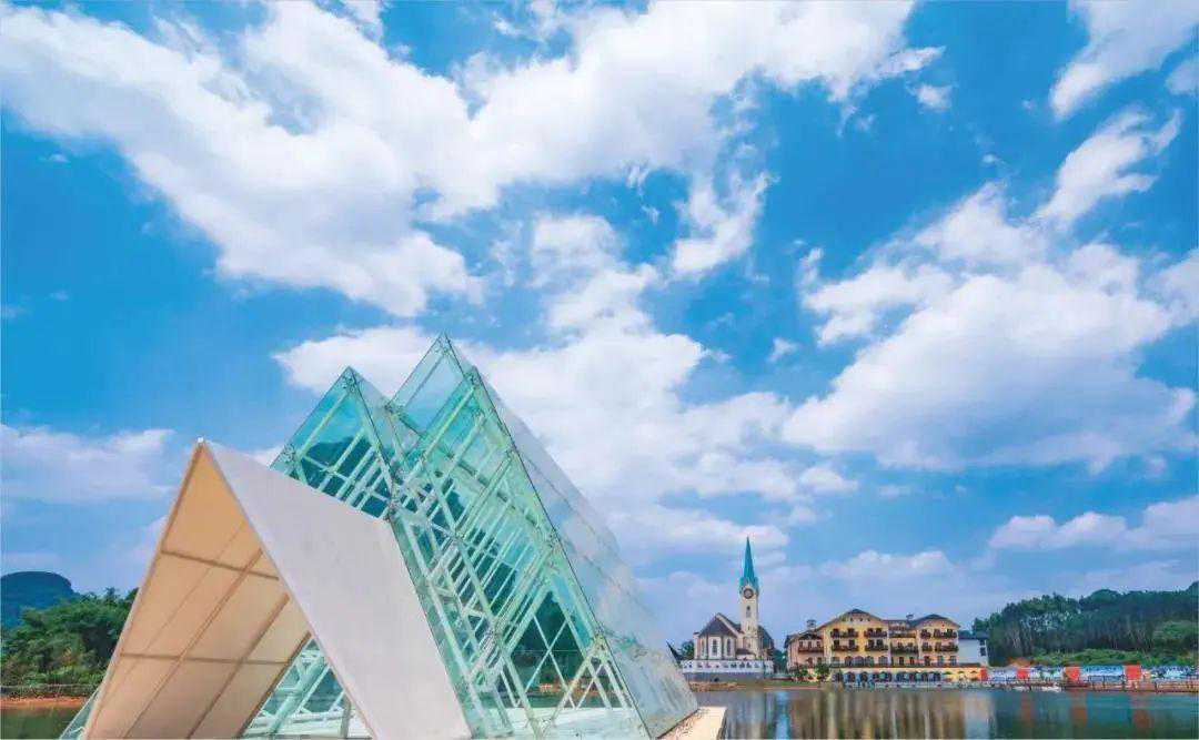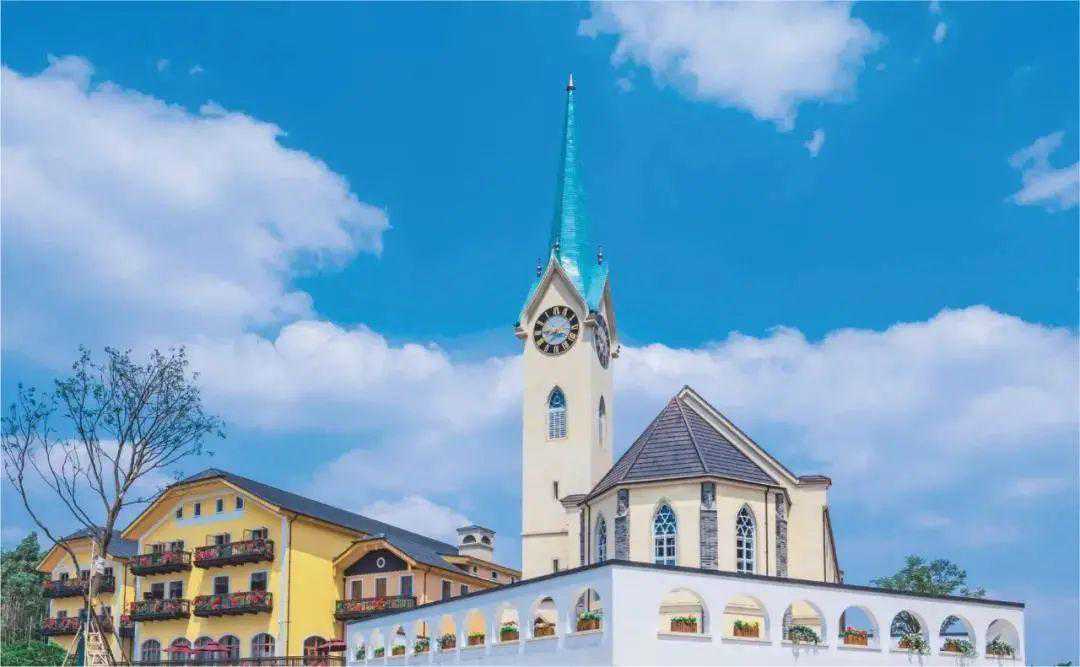 湖畔婚礼堂是典型的哥特式建筑风格,哥特式建筑是以法国为中心发展起来的,其特点是尖塔高耸,雄伟的外观和教堂内空阔的空间,再结合镶着彩色玻璃的长窗,使礼堂内产生一种浓厚的神圣气氛。另外,当时的礼堂作为城市公共生活的中心,成为市民大会堂,公共礼堂,甚至可用作市场和剧场。如今江宇梦想小镇将这座神圣的礼堂复制到了南宁,游客不出国门便能欣赏到如此神圣又富有美好寓意的神圣建筑。