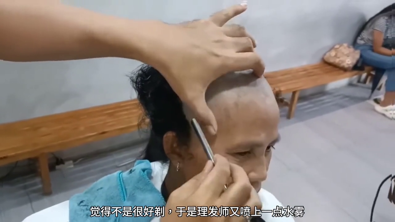 理发师继续用刮刀把后面的头发像这样剃干净,这是剃干净头发的样子,瞬间觉得一下子清爽多了。这是女子剃了头发后的样子了,真的太丑了,这样都无法直视了,老公真是被气到。