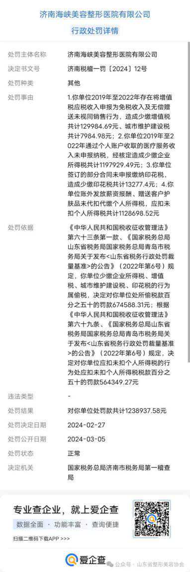 济南税稽一罚〔2024〕12号显示,济南海峡美容整形医院有限公司2019年至2022年存在将增值税应税收入申报为免税收入及无偿赠送未视同销售行为,造成少缴增值税共计129984.69元、城市维护建设税共计7984.98元;2019年至2022年通过个人账户收取的医疗服务收入未申报纳税,经核定造成少缴企业所得税共计1197929.49元;签订的部分合同未申报缴纳印花税,造成少缴印花税共计13277.4元;账外发放薪资报酬、赠送客户护肤品未代扣代缴个人所得税,应扣未扣个人所得税共计1128698.52元。