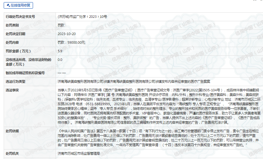 信用中国(山东)网站显示,去年10月20日,济南海峡美容整形医院有限公司还曾因涉嫌发布内容未经审查的医疗广告被济南市历城区市场监督管理局处罚款59000.00元。