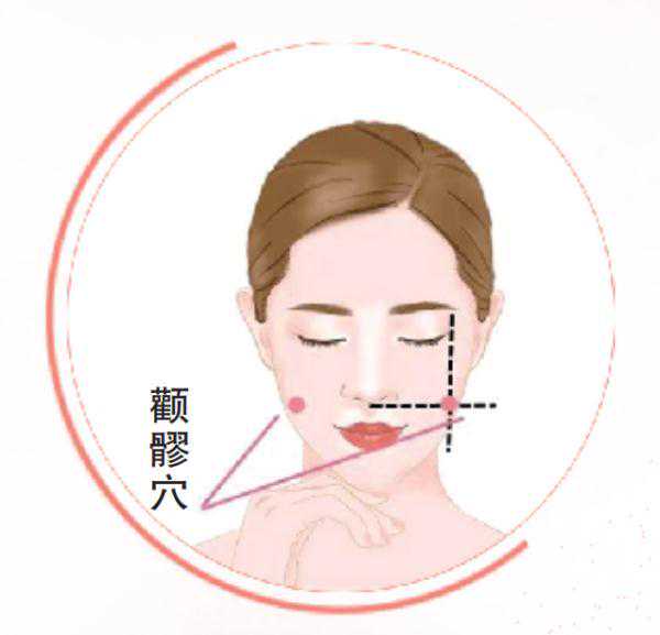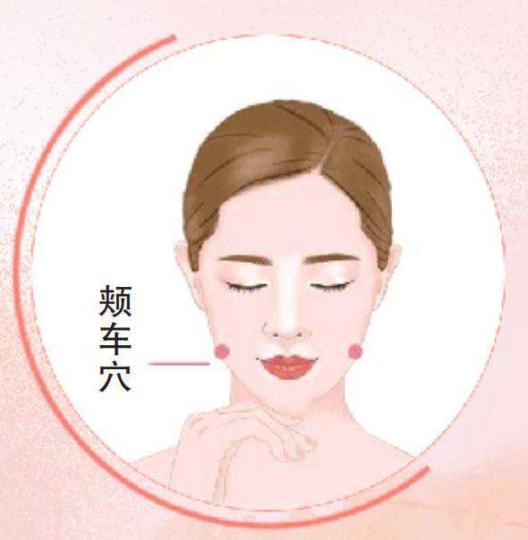 按揉下颌角前上方,咀嚼时肌肉隆起时出现的凹陷处(颊车穴),能够舒展面部肌肉,调和面颊机能,消除脸颊浮肿,纠正口歪等。