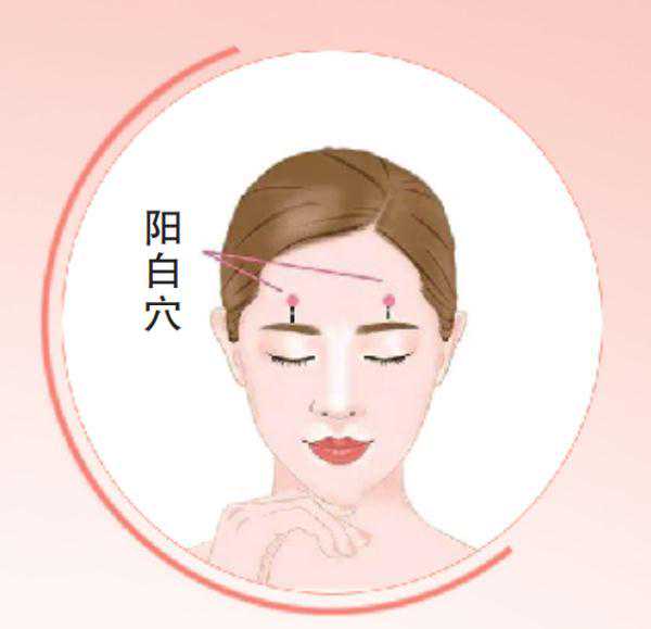 按揉瞳孔直上,眉上1寸处(阳白穴),发挥改善面部皱纹、迎风流泪、眩晕、眼睑下垂、面肌痉挛等作用。