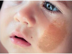 胎记中有一种红色的称为鲜红斑痣,民间俗称为“红胎记”或“血管瘤”。多发生于头、面、颈部。出生时表现为平坦的粉红色斑块,随着年龄的增长而变成红色和紫红色。