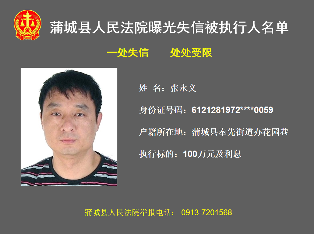 被执行人张永义,因拒不履行(2020)陕05民终108号民事裁定书确定的义务,已被蒲城县人民法院纳入失信被执行人名单,依法进行以下信用惩戒: