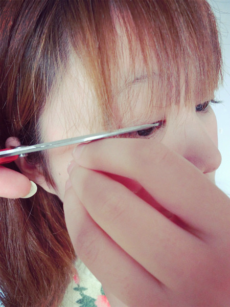 依然把头发分成两层,因为我们已经剪好刘海了,所以发尾我们就不需要在修剪了,我们只需要把多余的刘海剪掉就可以了,手法依然是斜着从上到下,慢慢的拉剪,剪刀自己觉得适合即可