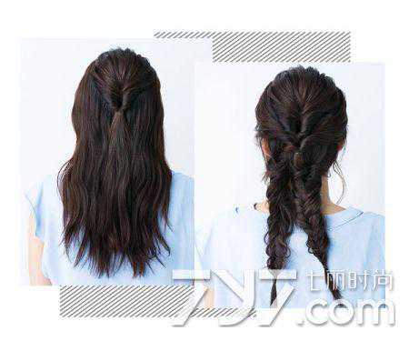 第二步:然后将剩下的头发分成左右两部分,并编织成鱼骨辫,至发尾时用橡皮筋固定好。