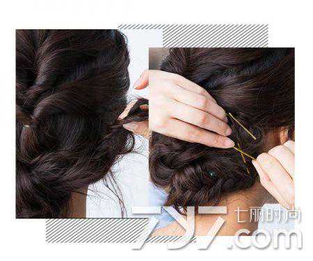 第四步:用黑色小发卡固定好辫子,然后再慢慢别上金色小发卡来作为装饰,就完成这款好看的盘发了。