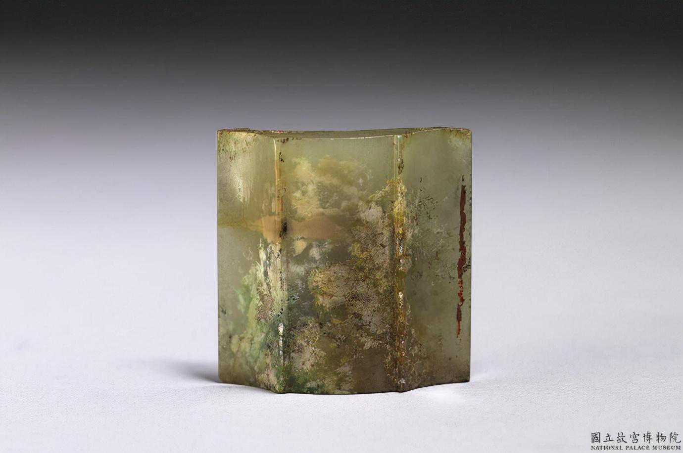 東周玉飾片。青玉,有白斑、青綠斑、赭斑,表面帶有一些附著物。方形玉片,如瓦片般,一面鼓起,一面內凹。突起的面雕兩道棱脊,另一面有一道棱脊。全器無穿孔。2.3公分公分公分。國立故宮博物院。