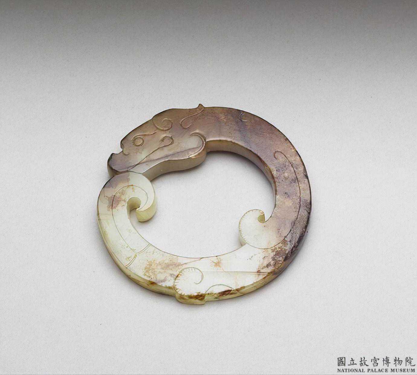 戰國玉龍紋珮。玉質,色灰白,有赭斑。器作一龍,龍首尾相接而成環形,正反面均有凹線琢示龍首、龍尾。厚0.65公分徑5.7公分最大孔徑3.8公分。國立故宮博物院。