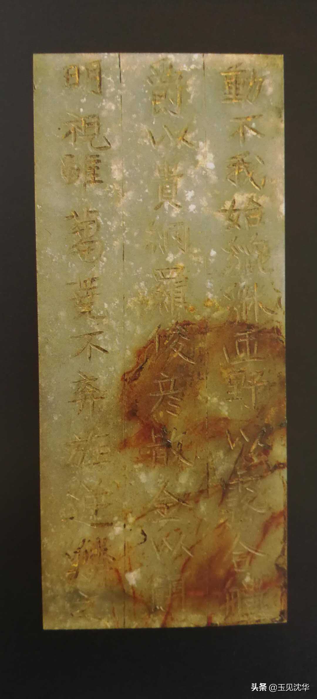 東周玉飾片。青玉,深沁赭斑和白斑。長方形玉片,四周有凹凸齒棱,單面淺浮雕雲紋,間有斜線紋,組合而成龍紋。四角各鑽一孔。2.7公分公分公分。國立故宮博物院。