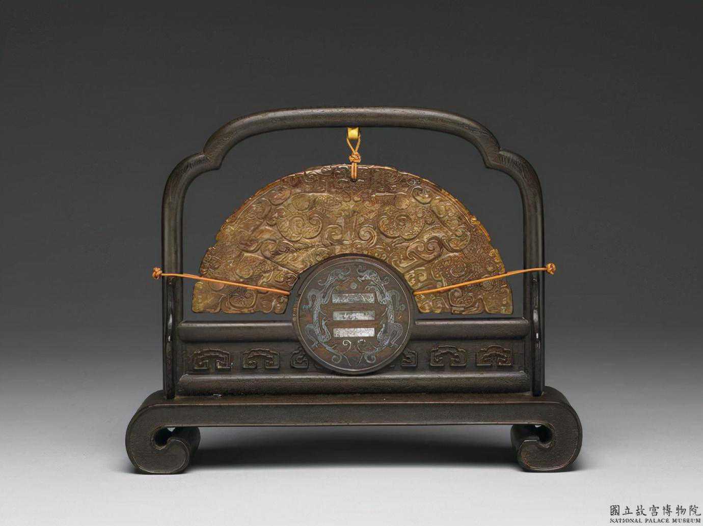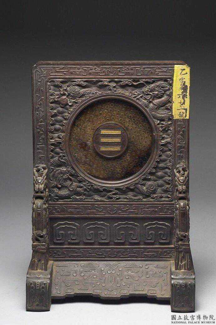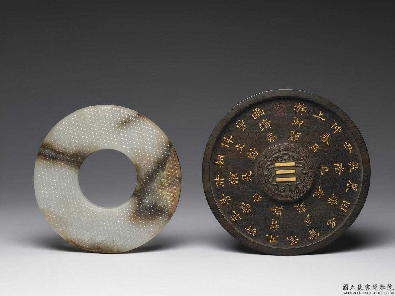 戰國至西漢蒲紋璧。青玉,有璺,器面出現糖包白玉料的規律性變化。圓璧形,有廓,附木座。雙面同紋,以數道交錯直線刻出規整的蒲紋。木座中央有圓突,內刻「雙龍乾卦」印與回紋,外可嵌小圓璧之面上,另刻有御製詩文「幽壙弗曾。伴土封如。脂猶是昔。年容白珩。非寶斯為。寶多穀多。因瑞在震。乾隆巳丑。仲春月上澣御題。」厚0.5公分內徑5.9公分外徑14.8公分。國立故宮博物院。
