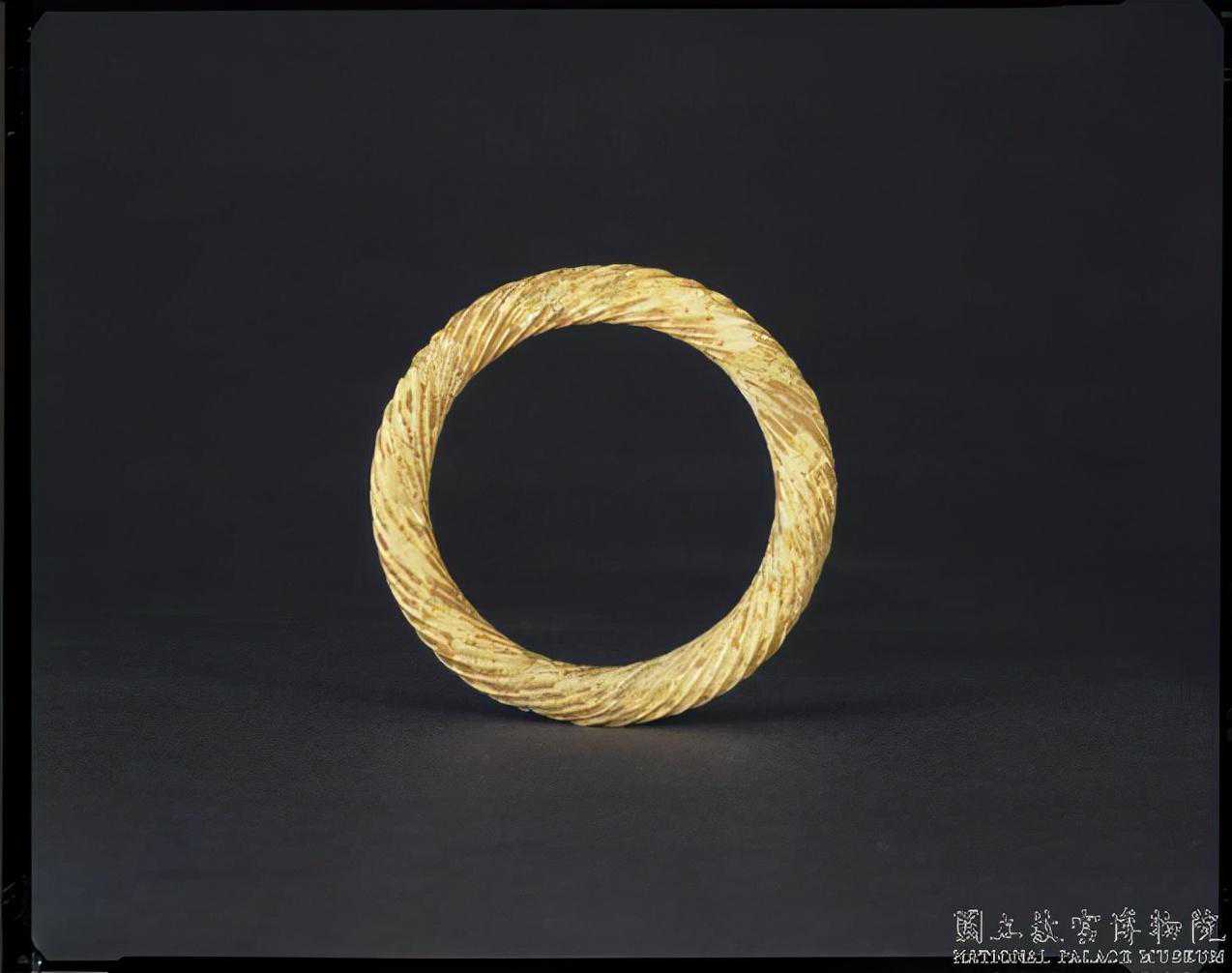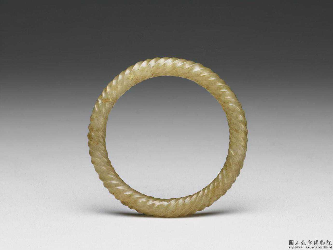 戰國晚期至西漢早期絞絲紋環。雞骨白色。圓整,器上飾絞絲紋,絞絲不密集,排列整齊。直徑6.56公分孔徑4.91公分厚0.5公分。國立故宮博物院。
