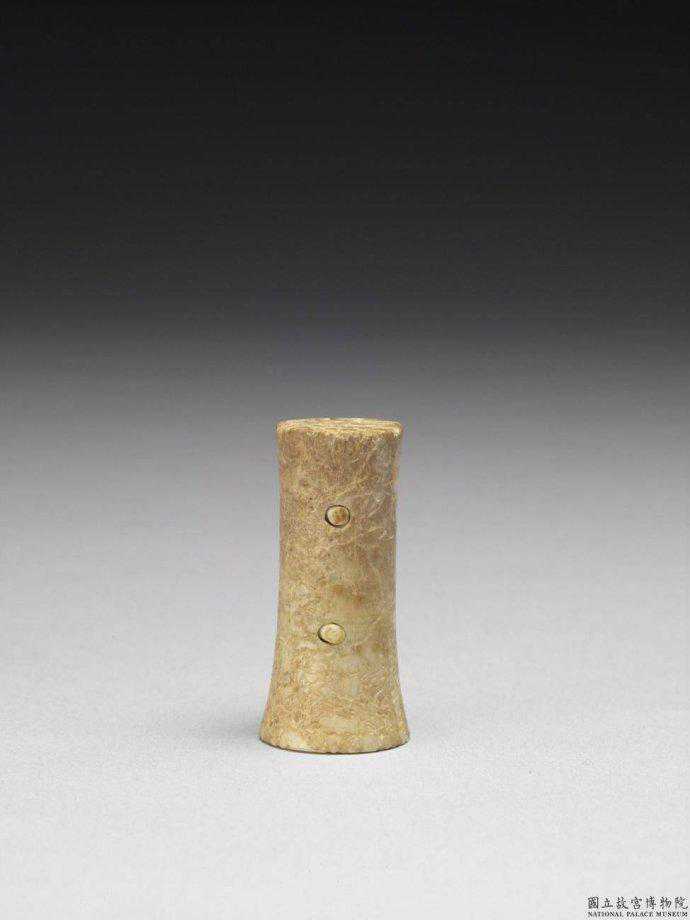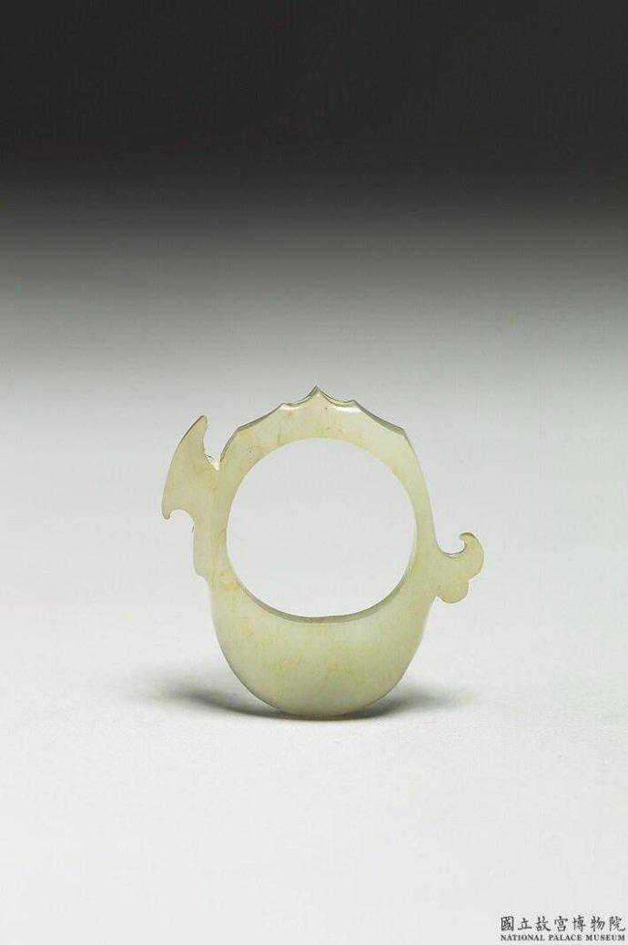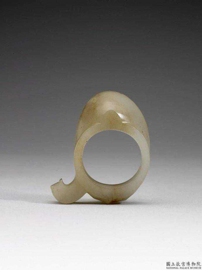 戰國玉韘。白玉泛赭斑。圓筒狀,一端平齊,一端斜口,附原作鉤弦之用的小鉤。國立故宮博物院。