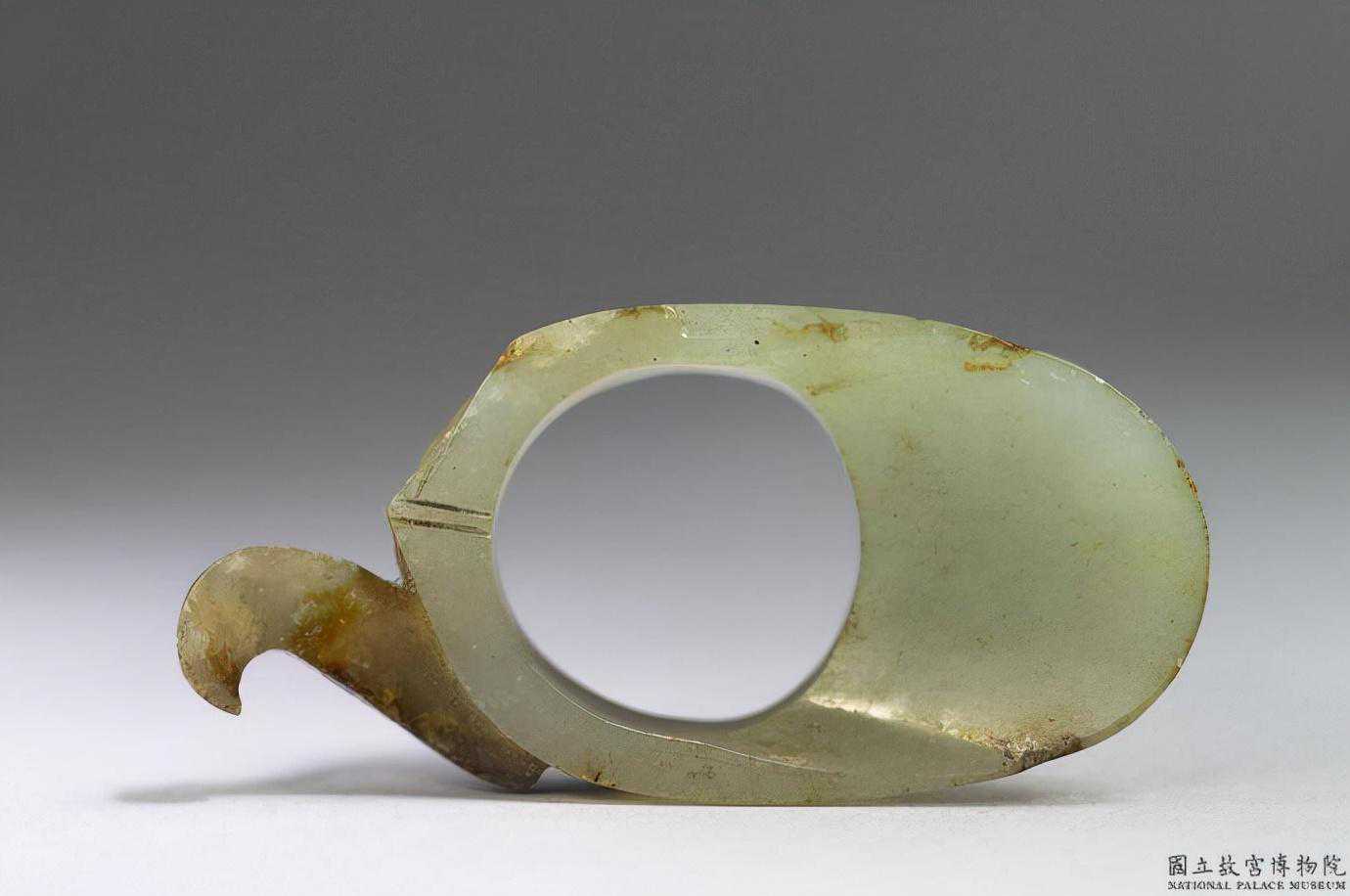 戰國單勾式韘形玉珮。青玉,帶黃赭斑,細潤光亮。韘形玉佩是源自玉韘發展的佩飾器。此件上端無穿孔,僅琢以凹槽,以供繫綬。長4.5公分。國立故宮博物院。